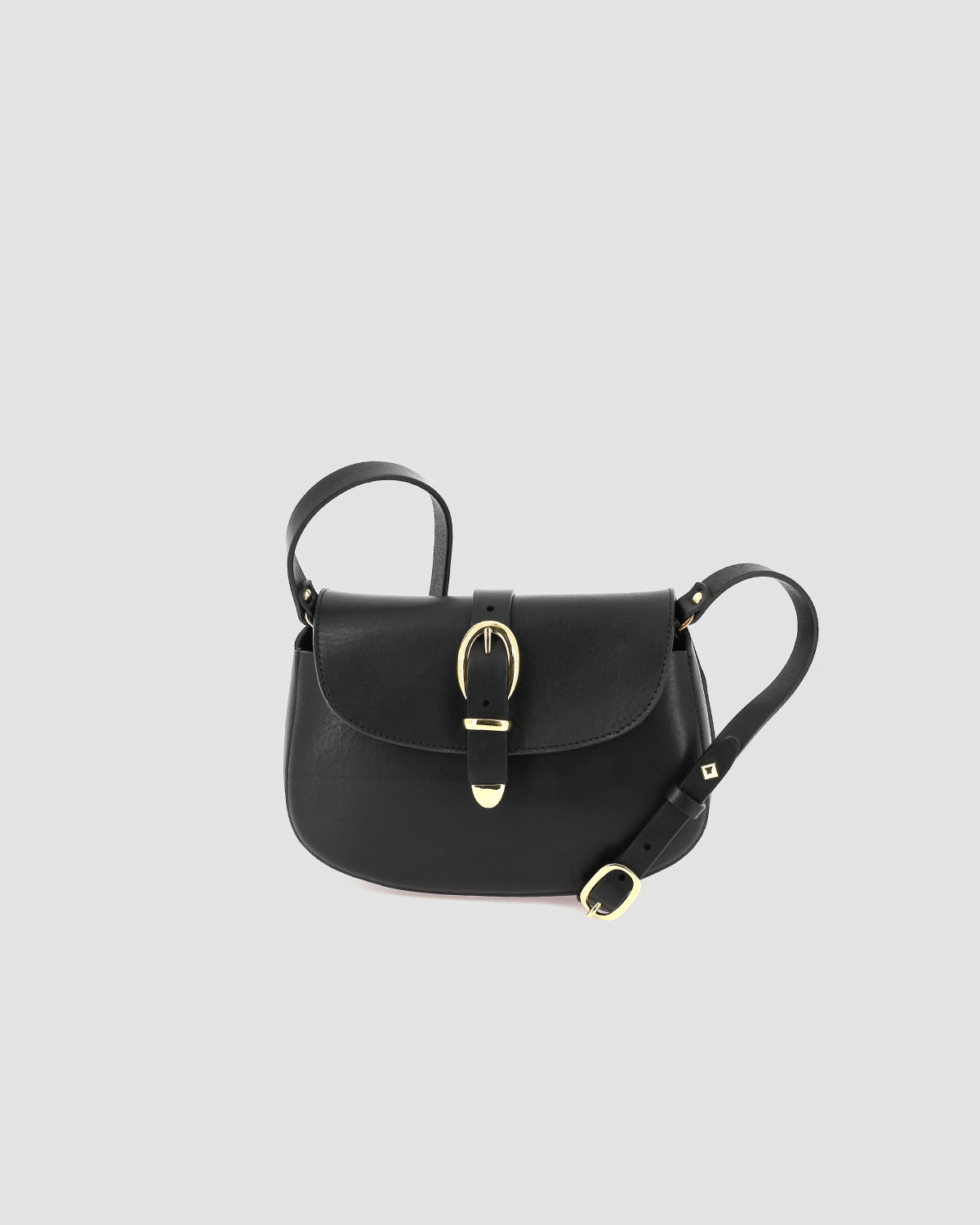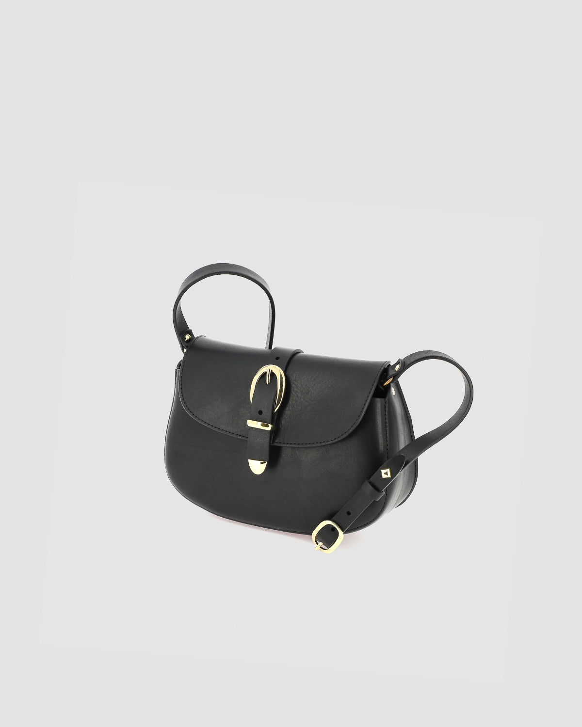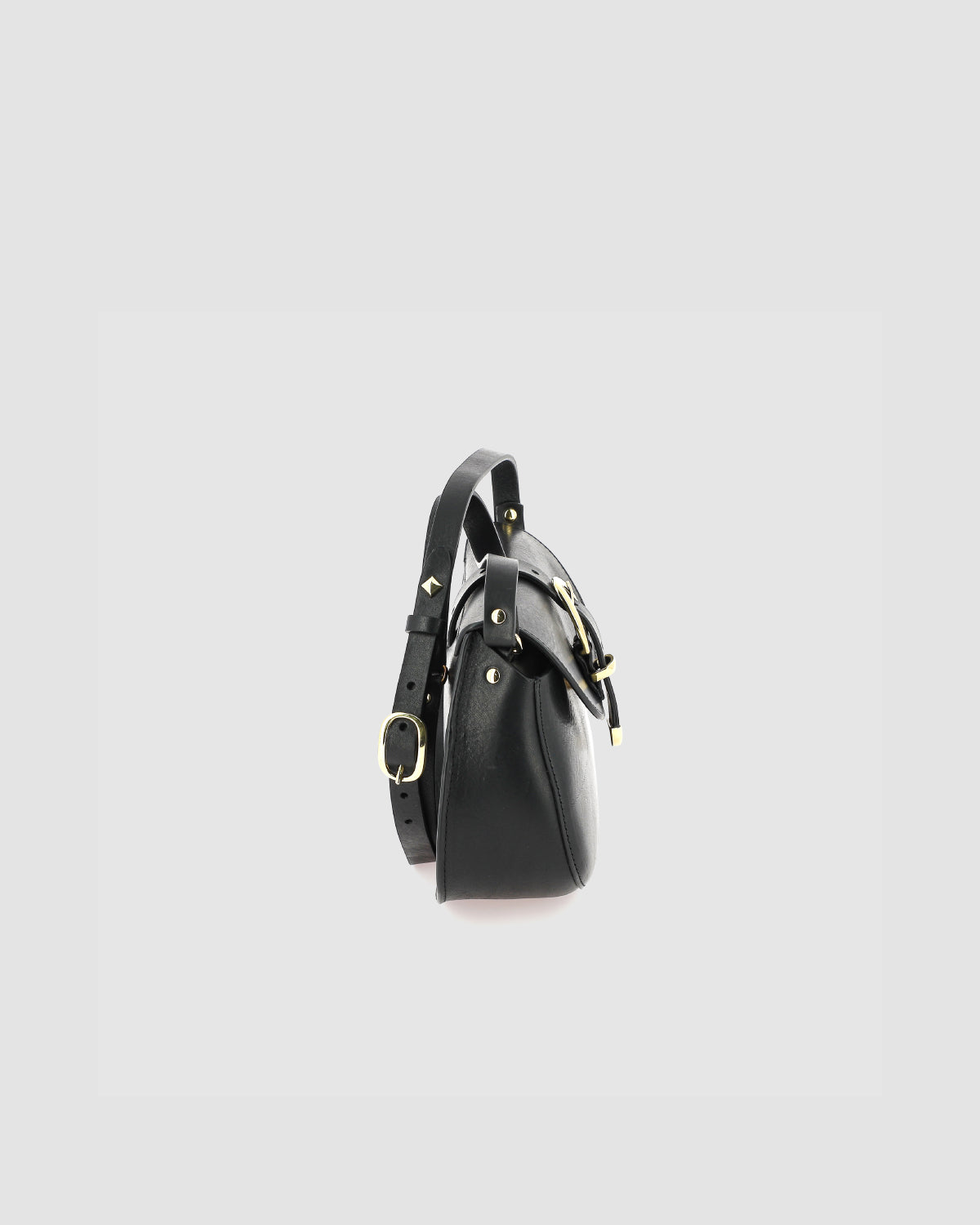 - Rabat avec bouton pression aimanté et patte de fermeture avec boucle et embout décoratifs en laiton